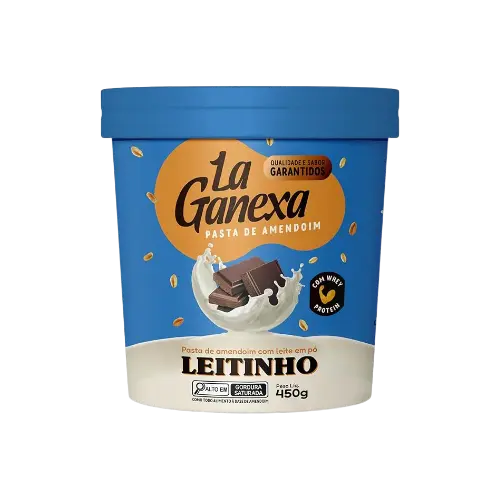 A Pasta de Amendoim Leitinho com Whey Protein La Ganexa é uma combinação cremosa de amendoim torrado, leite em pó desnatado, chocolate branco zero açúcar, creme de leite em pó, whey protein e chocolate ao leite zero açúcar. É livre de açúcares adicionados e glúten, oferecendo sabor adocicado aliado a perfil nutricional equilibrado.