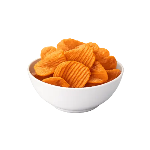 As batatas passam por seleção, corte, fritura ou extrusão conforme formulação, recebendo aplicação de tempero sabor barbecue. Após resfriamento, são embaladas garantindo padrão de qualidade e segurança alimentar.