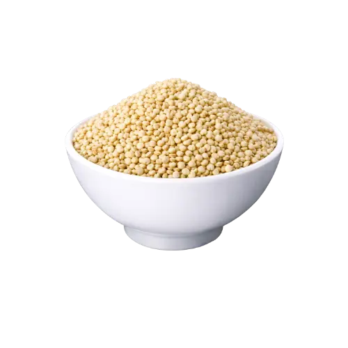 Grãos pequenos de coloração branca ou perolada.