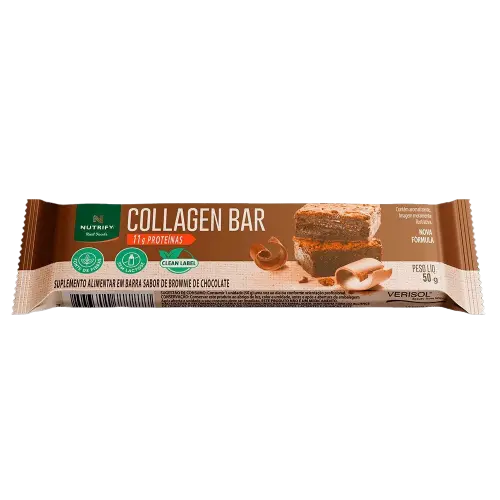A barra de proteína Nutrify Collagen Bar sabor brownie de chocolate é uma opção prática e nutritiva que fornece 11 g de proteína por porção, sendo formulada com colágeno hidrolisado bioativo VERISOL®, ingrediente associado ao cuidado com pele, unhas e cabelos. Apresenta sabor intenso de chocolate inspirado em brownie e textura agradável, sendo indicada para consumo como lanche equilibrado ao longo do dia.