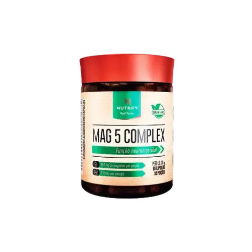 O Mag 5 Complex da Nutrify é um suplemento alimentar desenvolvido com cinco fontes de magnésio — bisglicinato, malato, citrato, taurato e ascorbato — que atuam de forma complementar no organismo. O magnésio é um mineral essencial para o funcionamento adequado dos músculos, do sistema nervoso e para o equilíbrio geral do corpo. O produto é vegano e livre de glúten, sendo indicado para pessoas com restrições alimentares ou que buscam suporte nutricional diário.
