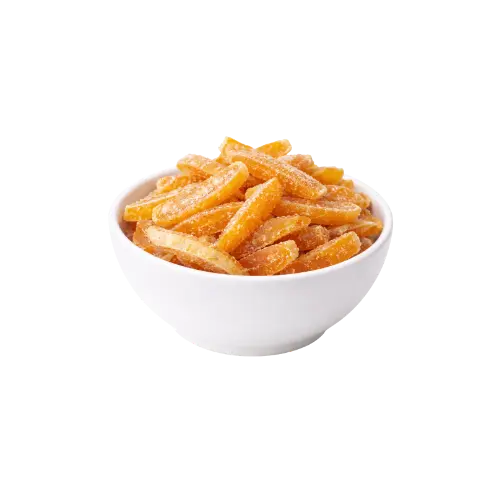 A Laranja em Casca Cristalizada é um produto obtido a partir da casca da fruta, submetida a processo de cozimento e cristalização, resultando em sabor cítrico adocicado, textura macia e leve cobertura açucarada. Possui aroma marcante e coloração característica, sendo amplamente utilizada em preparações doces e panificação.