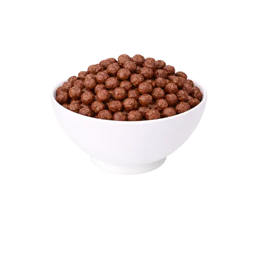 Os cereais são processados e moldados em formato esférico por extrusão, submetidos à secagem e posteriormente recobertos com cobertura sabor chocolate. Após resfriamento, passam por inspeção e embalagem garantindo qualidade e segurança alimentar.