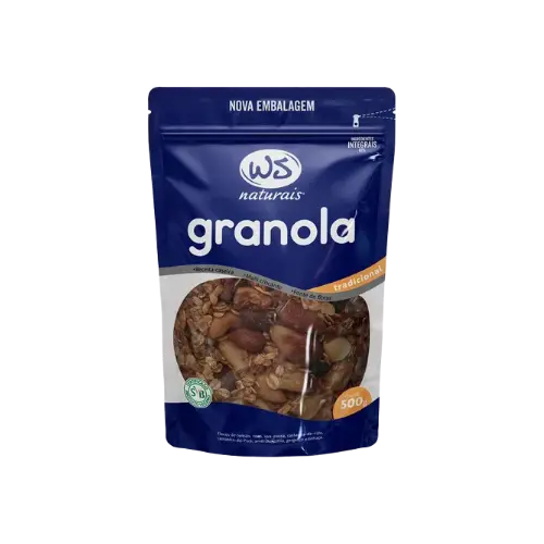 A Granola Tradicional é um alimento pronto para consumo, feito a partir de uma cuidadosa seleção de ingredientes naturais e nutritivos. Ideal para consumo puro ou como complemento de receitas como bolos, salada de frutas, vitaminas, iogurtes e açaí. Com textura crocante e sabor agradável, destaca-se pelo equilíbrio entre os componentes saudáveis e deliciosos. Os grãos são tostados e apresentam uma coloração caramelo levemente dourada, proporcionando uma experiência sensorial única.