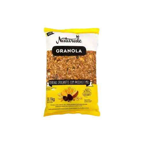 A granola passas e mel Naturale é uma mistura de cereais crocantes combinados com uvas-passas, castanha-do-pará e mel, desenvolvida para oferecer sabor adocicado característico e textura crocante. Indicada para consumo em diferentes momentos do dia, proporciona versatilidade e praticidade alimentar.