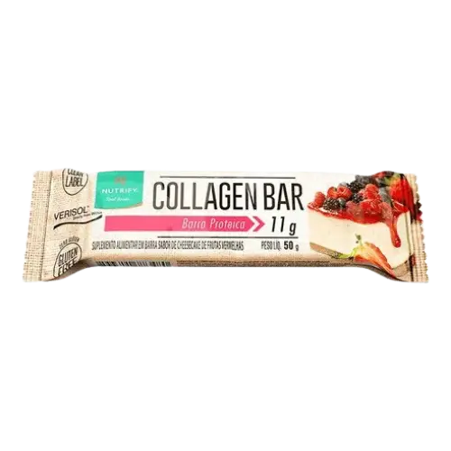 A barra de proteína Nutrify Collagen Bar sabor cheesecake de frutas vermelhas com chocolate é uma opção prática e nutritiva que fornece 11 g de proteína por porção, provenientes de colágeno hidrolisado e colágeno bioativo VERISOL®. Apresenta combinação equilibrada entre notas frutadas e cobertura de chocolate, com textura agradável e indicada para complementar a ingestão proteica ao longo do dia, especialmente após treinos ou atividades físicas.